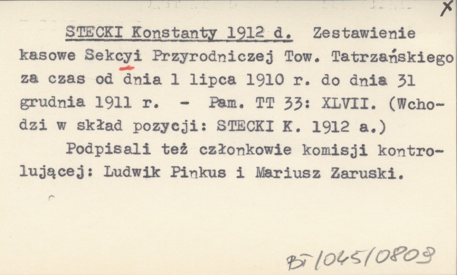 Pamiętnik Towarzystwa Tatrzańskiego, 33: XLVII. Podpisali też członkowie komisji kontrolującej: Ludwik Pinkus i Mariusz Zaruski. Wchodzi w skład pozycji: STECKI K. 1912 a.