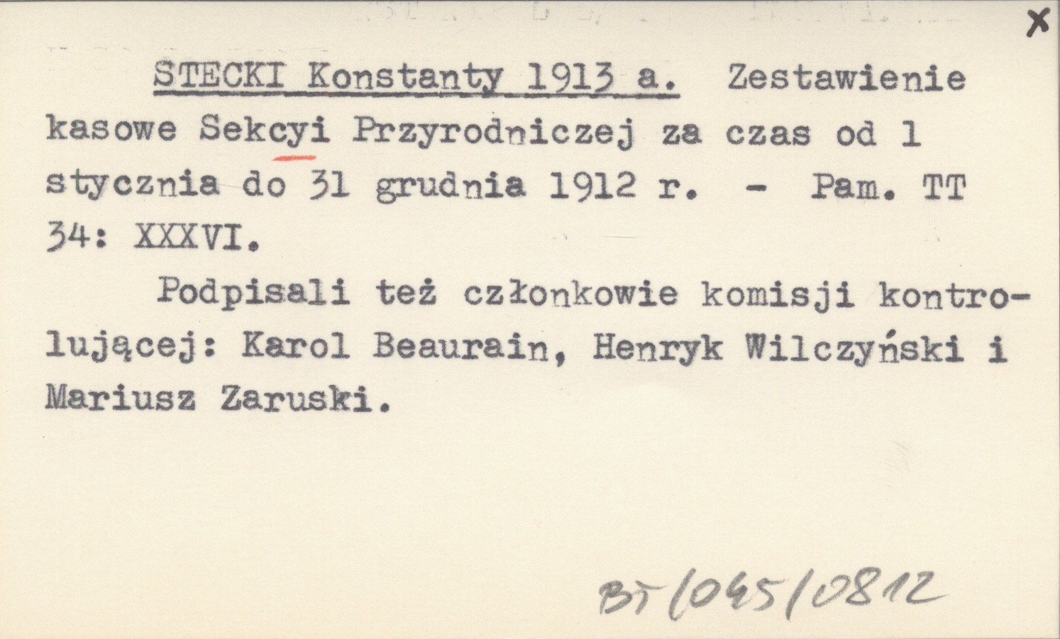 STECKI Konstanty 1913 a Zestawienie kasowe Sekcyi Przyrodniczej za czas od 1 stycznia do 31 grudnia 1912 r.