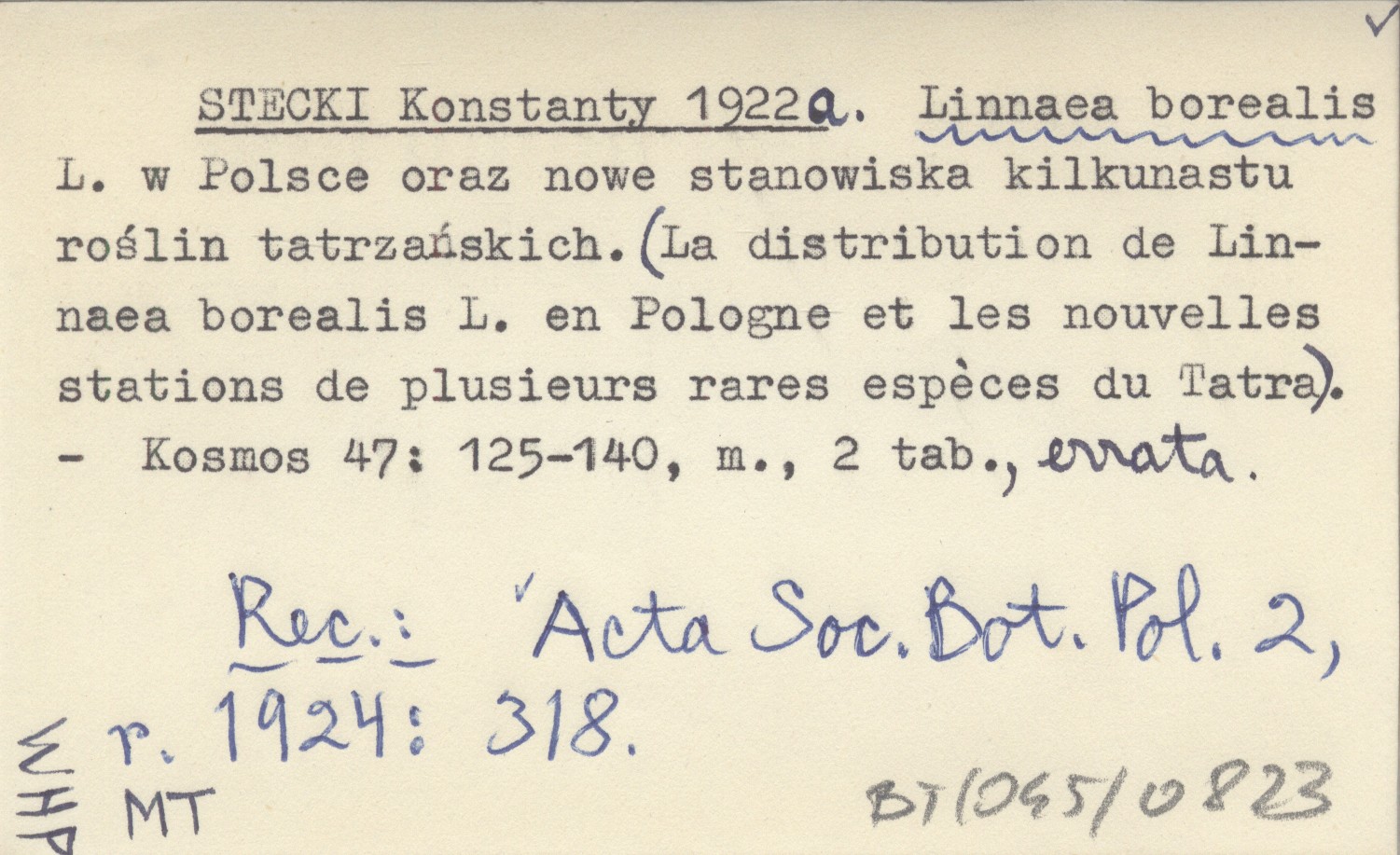 STECKI Konstanty 1922 a Linnaea borealis L. w Polsce oraz nowe stanowiska kilkunastu roślin tatrzańskich. (La distribution de Linnaea borealis L. en Pologne et les nouvelles stations de plusieurs rares espéces du Tatra).
