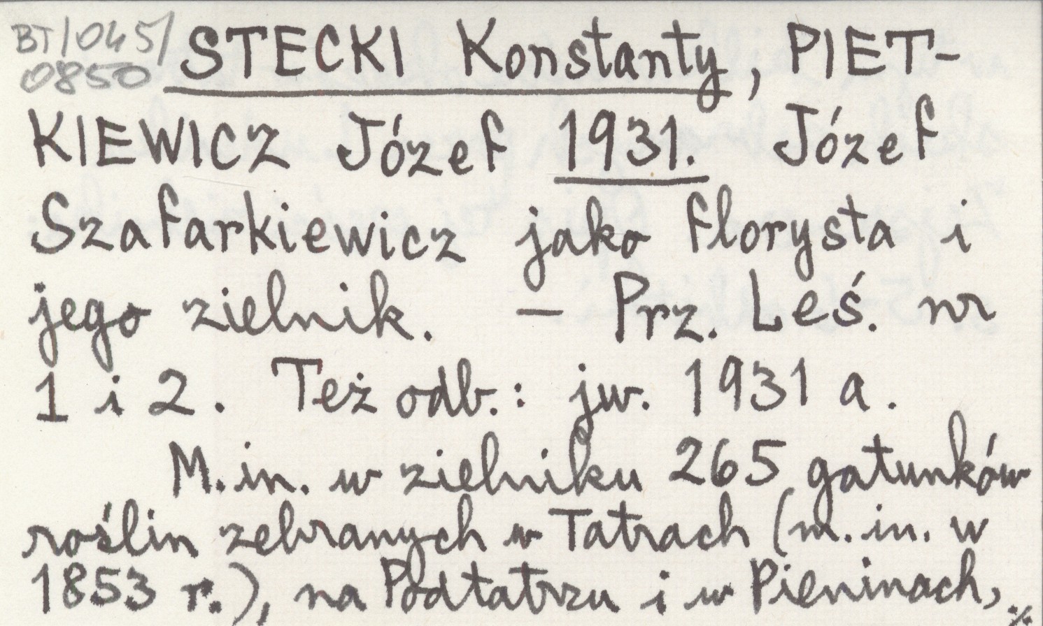Przegląd Leśniczy, Nr 1, 2. M. in. w zielniku 265 gatunków roślin zebranych w Tatrach (m. in. w 1853 r.), na Podtatrzu i w Pieninach, w tym kilkanaście okazów tatrzańskich zebranych przez Ludwika Zejsznera. Opis tej części zielnika: s. 5-6 odbitki. Też odb.: jw. 1931 a.