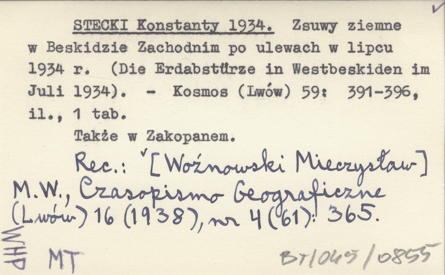 Kosmos (Lwów) , 59: 391-396, il., 1 k. Także w Zakopanem. REC: [WOŹNOWSKI Mieczysław] M. W., Czasopismo Geograficzne (Lwów) 16 (1938), nr 4 (61): 365.