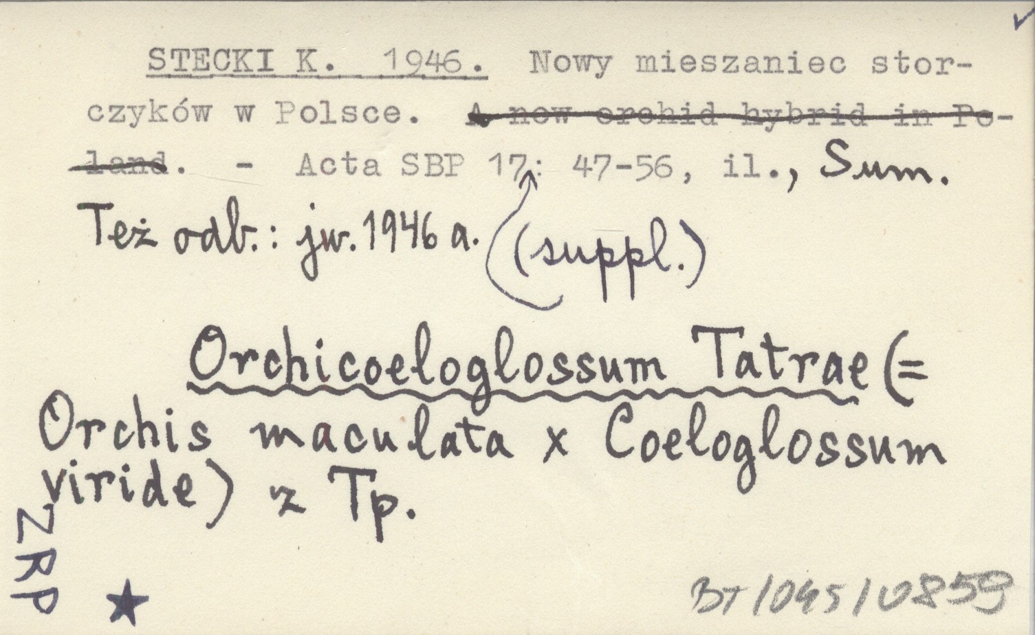 Acta Societatis Botanicorum Poloniae, 17 (suppl.): 47-56, il., Sum. Orchicoeloglossum Tatrae (=Orchis maculata x Coeloglossum viride) z Tatr polskich. Też odb.: jw. 1946 a.