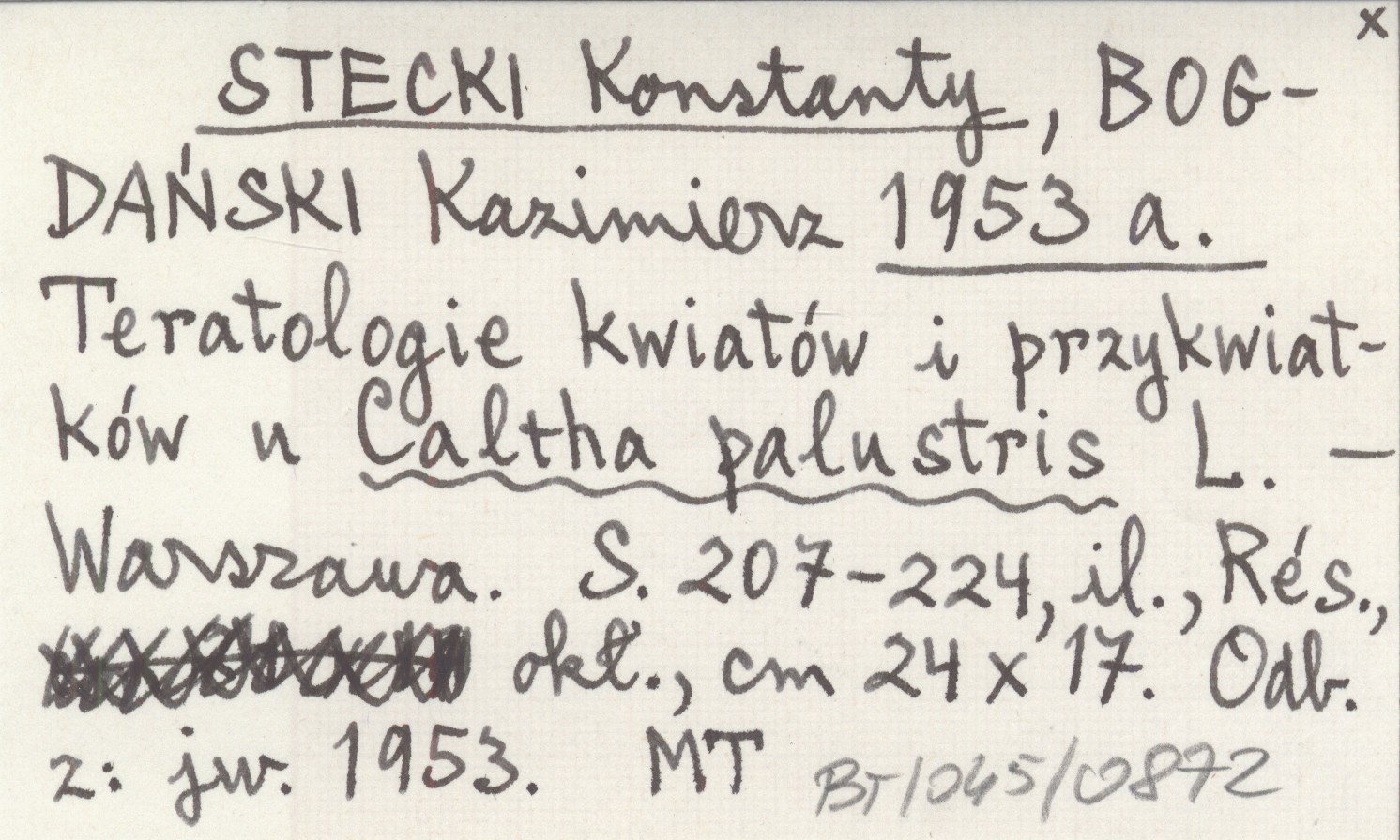 STECKI Konstanty BOGDAŃSKI, Kazimierz. ; 1953 a Teratologie kwiatów i przykwiatków u Caltha palustris L.