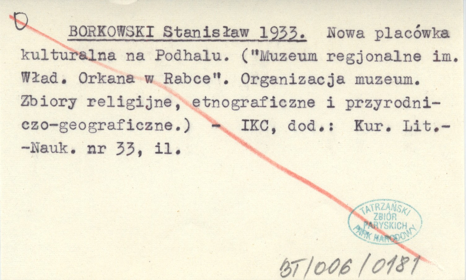 BORKOWSKI Stanisław 1933 Nowa placówka kulturalna na Podhalu. ("Muzeum regjonalne im. Wład. Orkana w Rabce". Organizacja muzeum. Zbiory religijne, etnograficzne i przyrodniczo-geograficzne.)