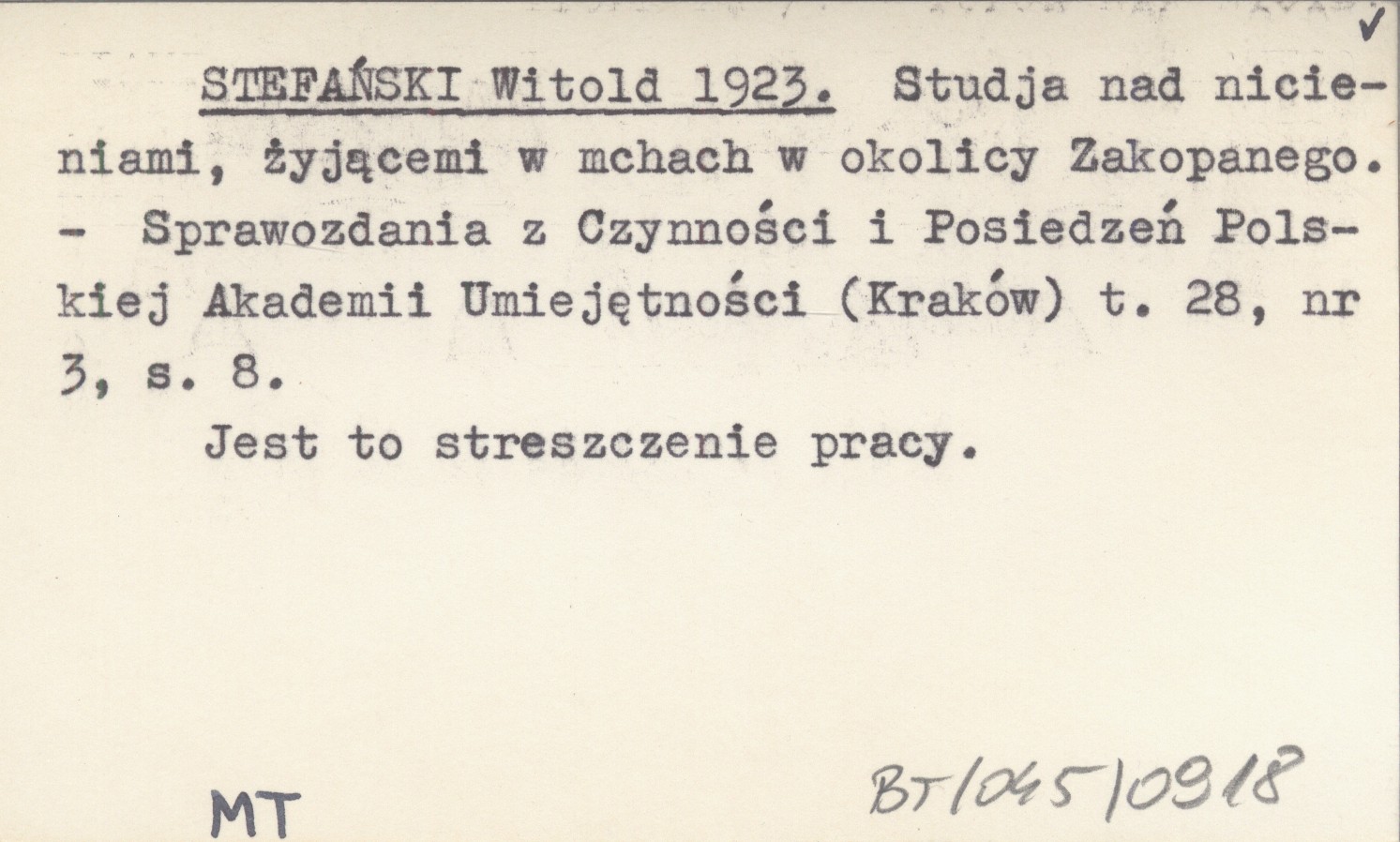 STEFAŃSKI Witold 1923 Studja nad nicieniami, żyjącemi w mchach w okolicy Zakopanego.