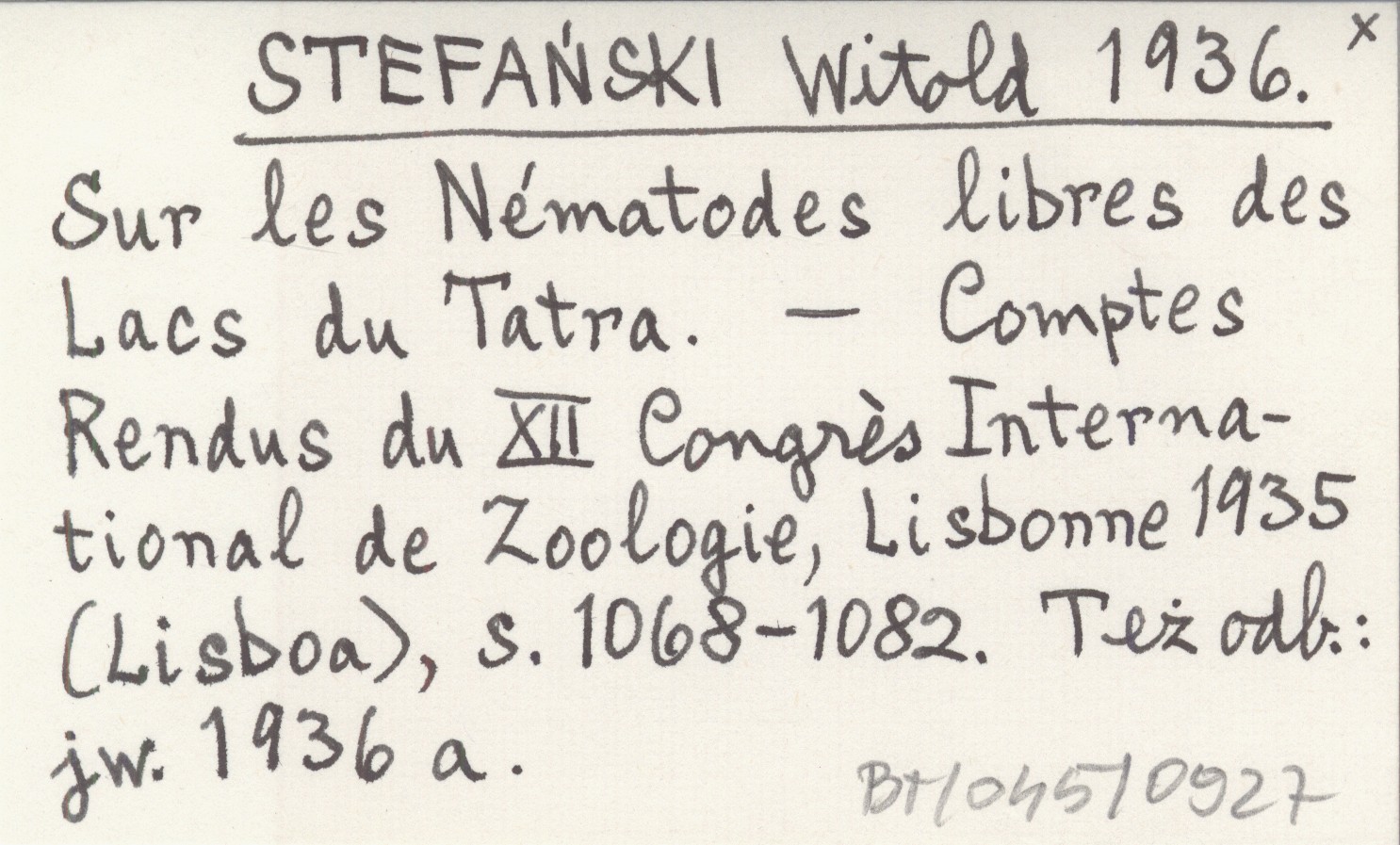 STEFAŃSKI Witold 1936 Sur les Nématodes libres des Lacs du Tatra.