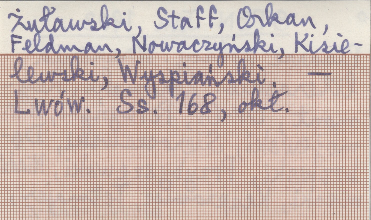 Pisarze polscy. Wrażenia literackie. Żeromski, Reymont, Or-Ot, Perzyński, Niemojewski, Sieroszewski, Dąbrowski, Przybyszewski, Niedźwiecki, Kasprowicz, Tetmajer, Żuławski, Staff, Orkan, Feldman, Nowaczyński, Kisielewski, Wyspiański.
