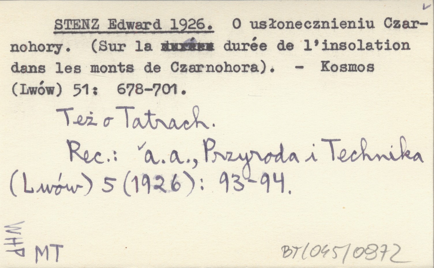 Kosmos (Lwów) , 51: 678-701. Też o Tatrach. REC: a. a., Przyroda i Technika (Lwów) 5 (1926): 93-94.