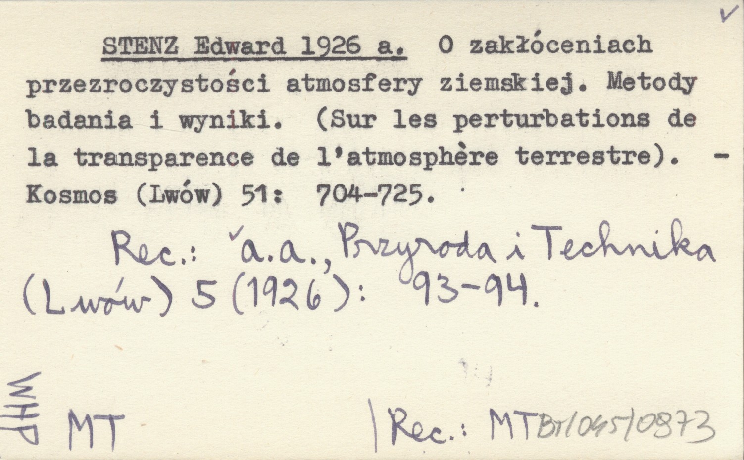 STENZ Edward 1926 a O zakłóceniach przezroczystości atmosfery ziemskiej. Metody badania i wyniki. (Sur les perturbations de la transparence de l'atmosphére terrestre).