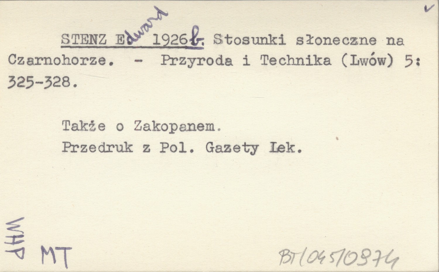 Przyroda i Technika (Lwów) , 5: 325-328. Także o Zakopanem. Przedruk z Polskiej Gazety Lekarskiej.