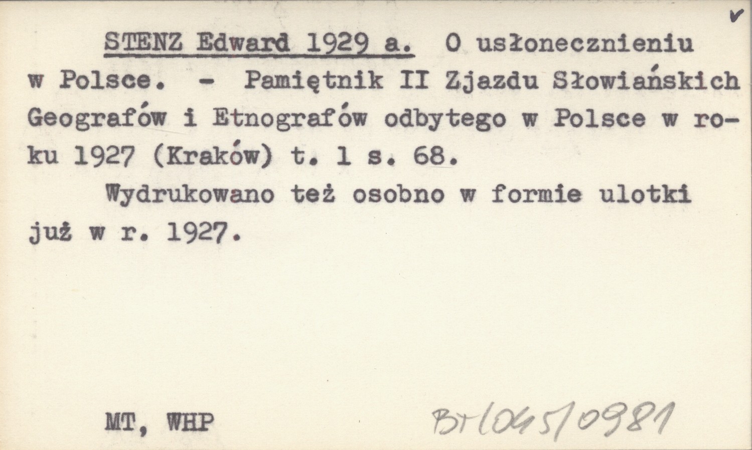 Pamiętnik II Zjazdu Słowiańskich Geografów i Etnografów odbytego w Polsce w roku 1927 Kraków , T. 1: 68. Wydrukowano też osobno w formie ulotki już w r. 1927.