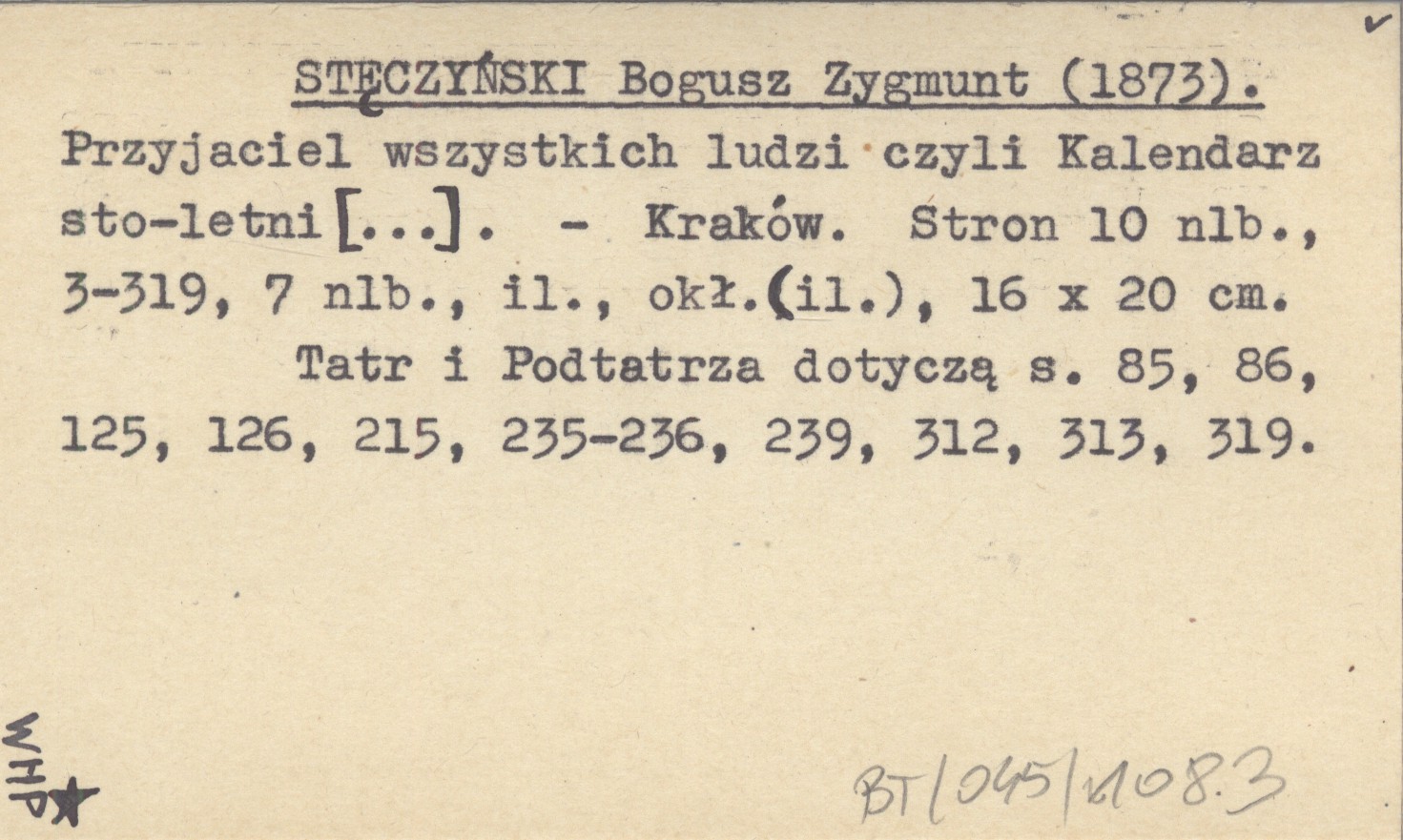 STĘCZYŃSKI Bogusz Zygmunt [1873] Przyjaciel wszystkich ludzi czyli Kalendarz sto-letni [...].