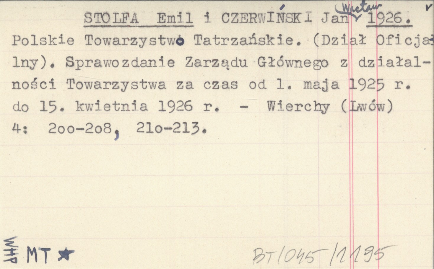 STOLFA Emil CZERWIŃSKI, Jan Wacław. ; 1926 Polskie Towarzystwo Tatrzańskie. (Dział Oficjalny). Sprawozdanie Zarządu Głównego z działalności Towarzystwa za czas od 1. maja 1925 r. do 15. kwietnia 1926 r.
