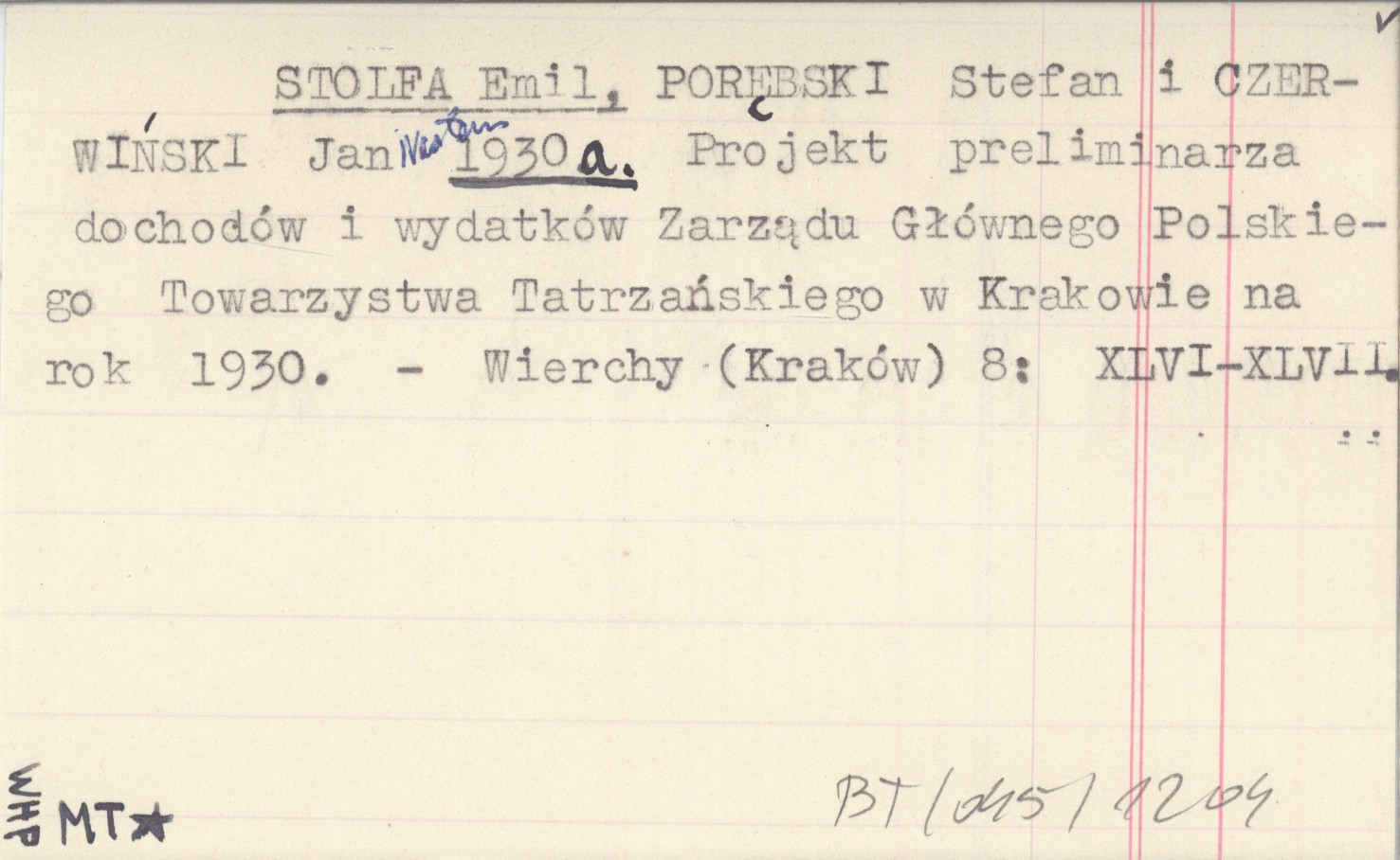 STOLFA Emil PORĘBSKI, Stefan. ; CZERWIŃSKI, Jan Wacław. ; 1930 a Projekt preliminarza dochodów i wydatków Zarządu Głównego Polskiego Towarzystwa Tatrzańskiego w Krakowie na rok 1930.