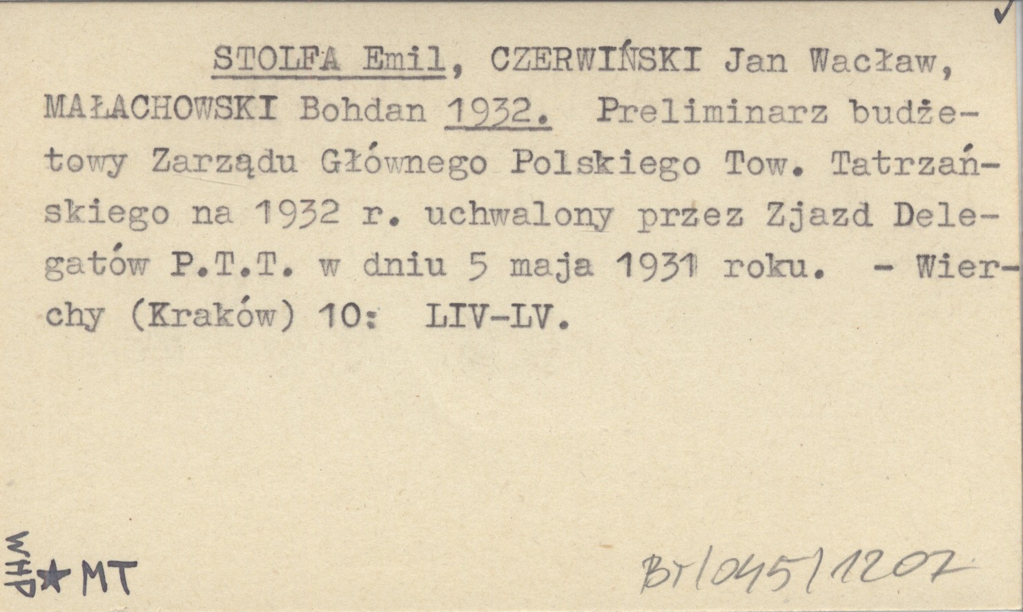 STOLFA Emil CZERWIŃSKI, Jan Wacław. ; MAŁACHOWSKI, Bohdan. ; 1932 Preliminarz budżetowy Zarządu Głównego Polskiego Tow. Tatrzańskiego na 1932 r. uchwalony przez Zjazd Delegatów P.T.T. w dniu 5 maja 1931 roku.