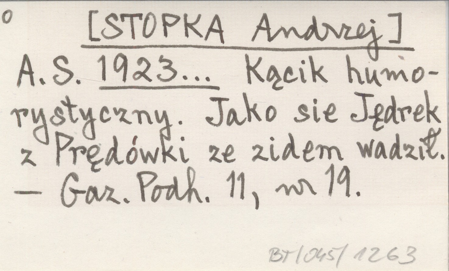 A. S. [STOPKA Andrzej] 1923... Kącik humorystyczny. Jako sie Jędrek z Prędówki ze zidem wadził.