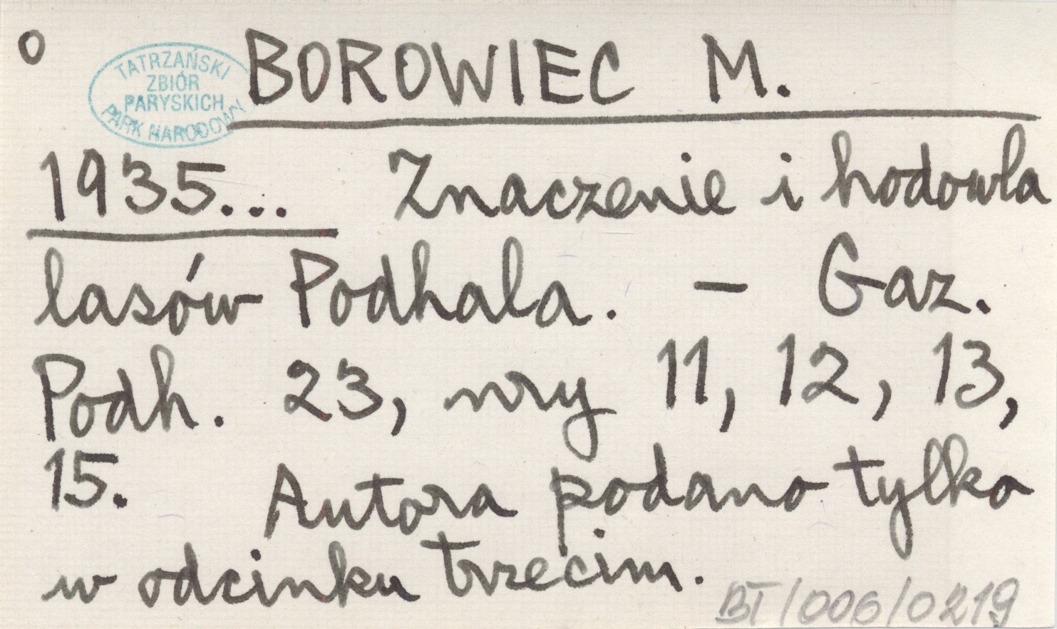 BOROWIEC M. 1935... Znaczenie i hodowla lasów Podhala.