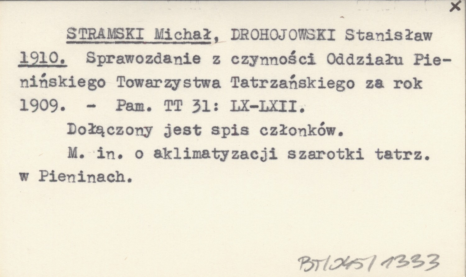 STRAMSKI Michał DROHOJOWSKI, Stanisław. ; 1910 Sprawozdanie z czynności Oddziału Pienińskiego Towarzystwa Tatrzańskiego za rok 1909.