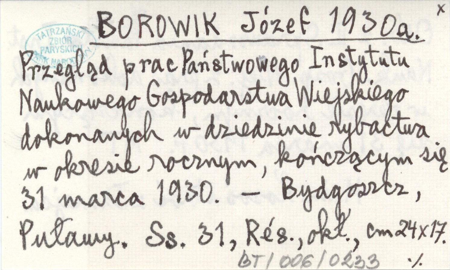 BOROWIK Józef 1930 a Przegląd prac Państwowego Instytutu Naukowego Gospodarstwa Wiejskiego dokonanych w dziedzinie rybactwa w okresie rocznym, kończącym się 31 marca 1930.