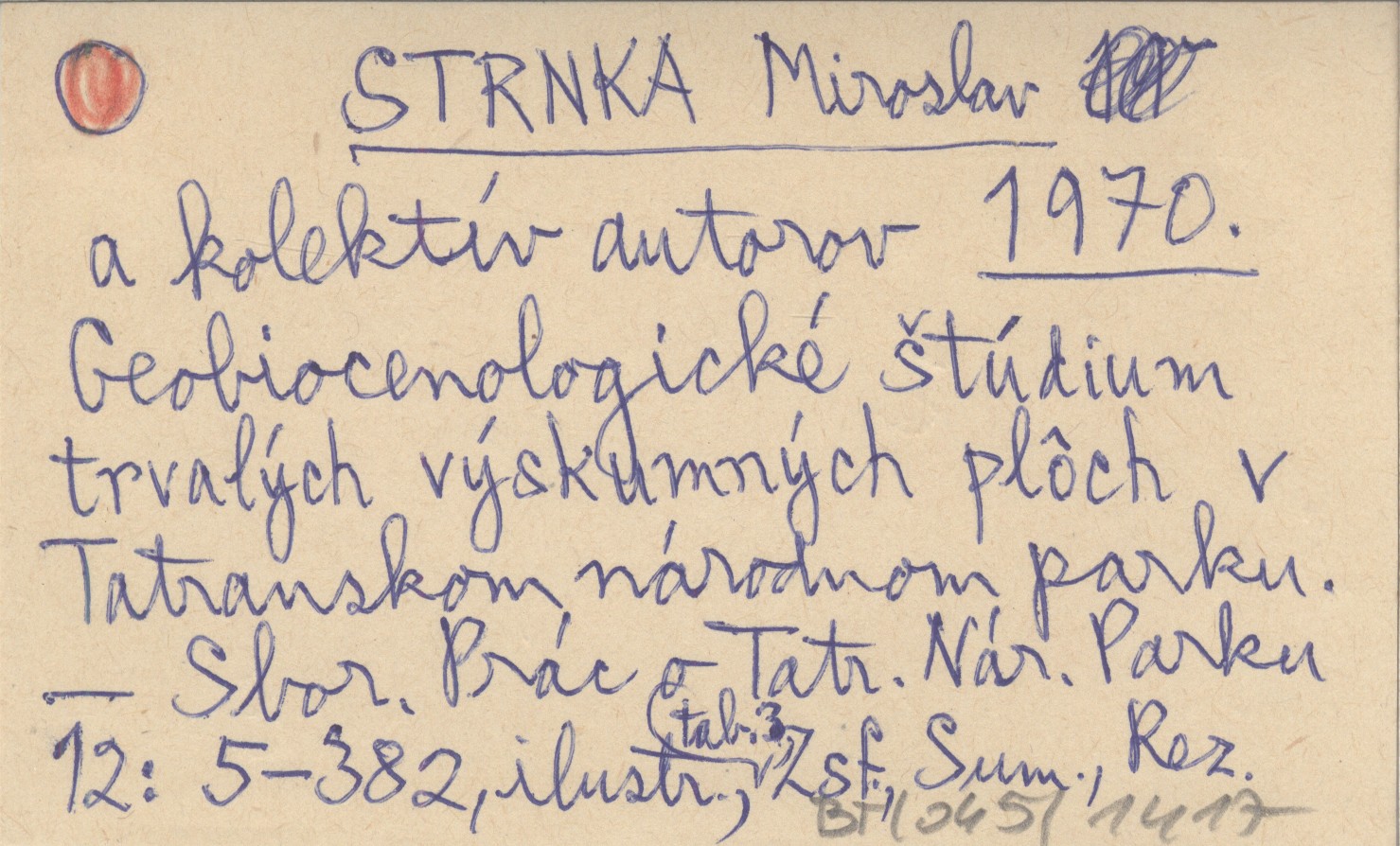 STRNKA Miroslav i in. ; 1970 Geobiocenologické čtúdium trvalęch vęskumnęch plôch v Tatranskom národnom parku.