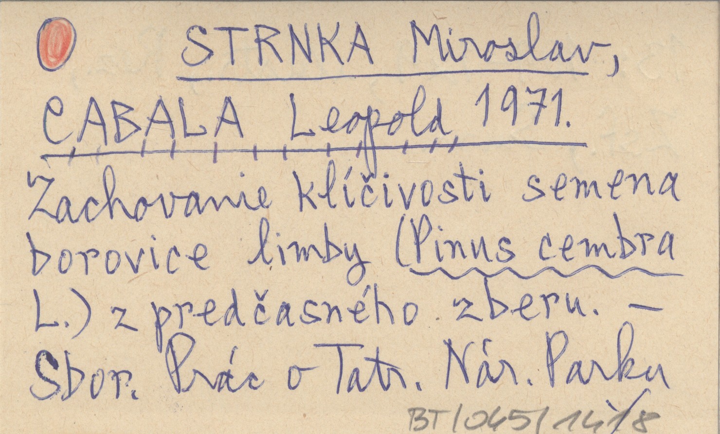 STRNKA Miroslav CABALA, Leopold. ; 1971 Zachovanie klíčivosti semena borovice limby (Pinus cembra L.) z predčasného zberu.