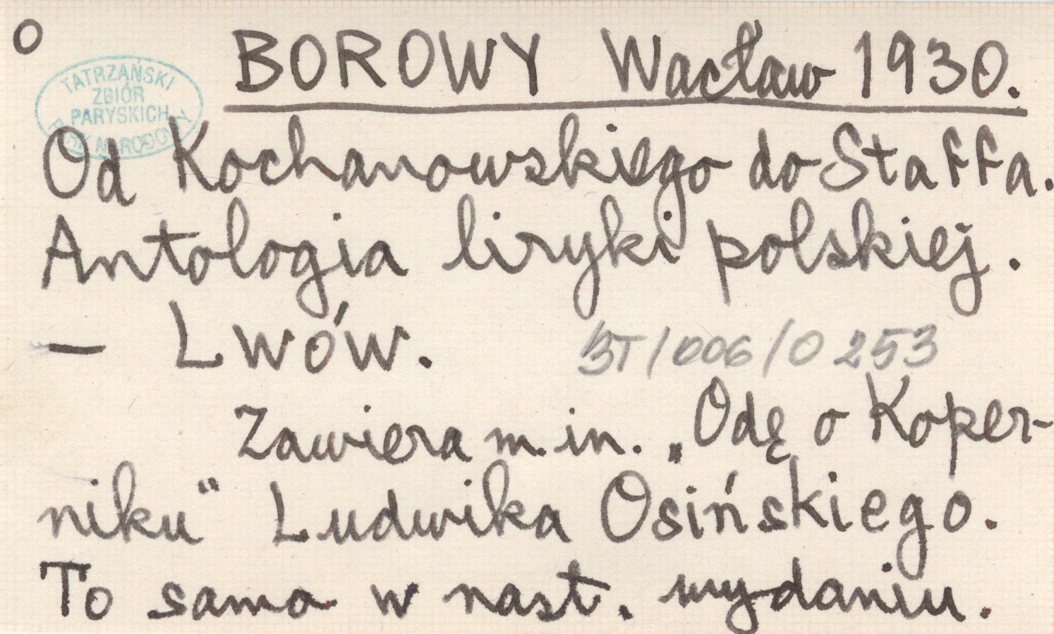 BOROWY Wacław 1930 Od Kochanowskiego do Staffa. Antologia liryki polskiej.