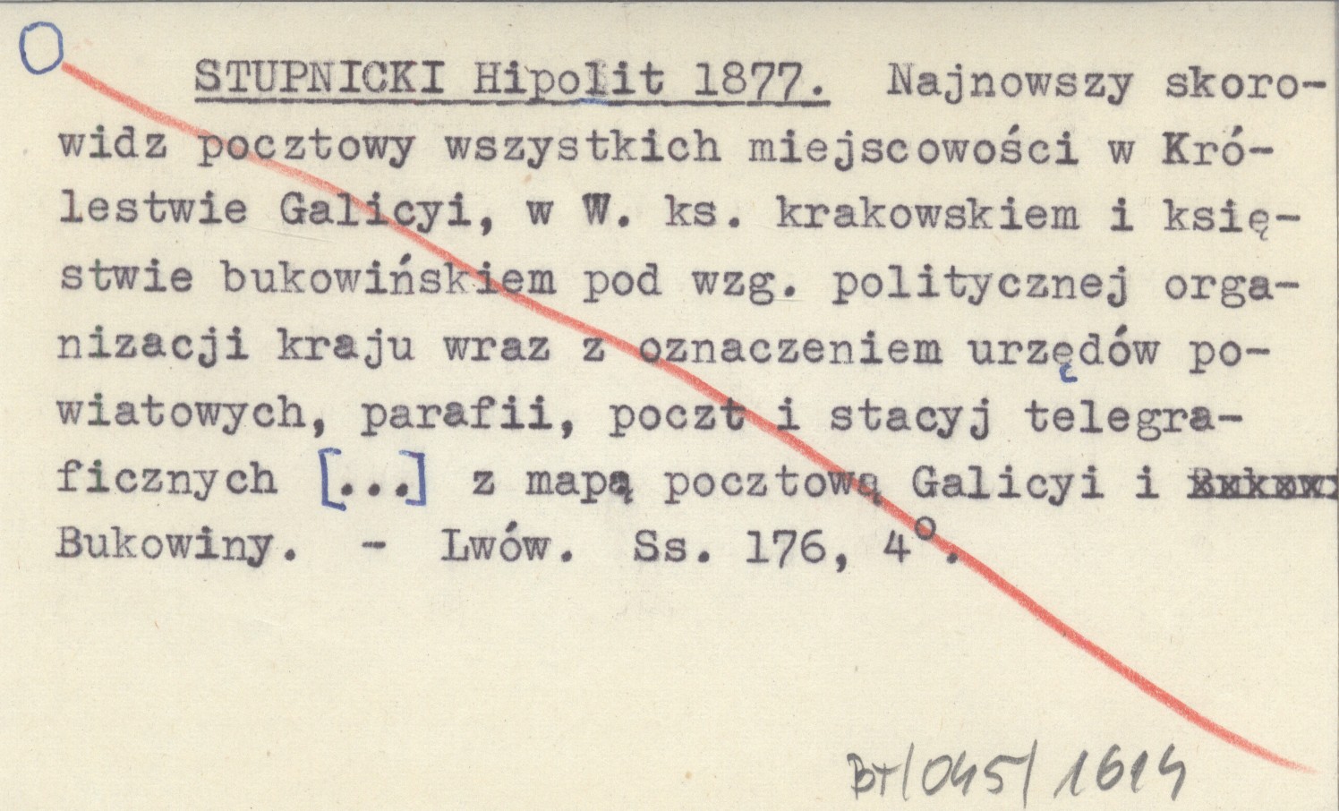 STUPNICKI Hipolit 1877 Najnowszy skorowidz pocztowy wszystkich miejscowości w Królestwie Galicyi, w W. ks. krakowskiem i księstwie bukowińskiem pod wzg. politycznej organizacji kraju wraz z oznaczeniem urzędów powiatowych, parafii, poczt i stacyj telegraficznych [...] z mapą pocztową Galicyi i Bukowiny.