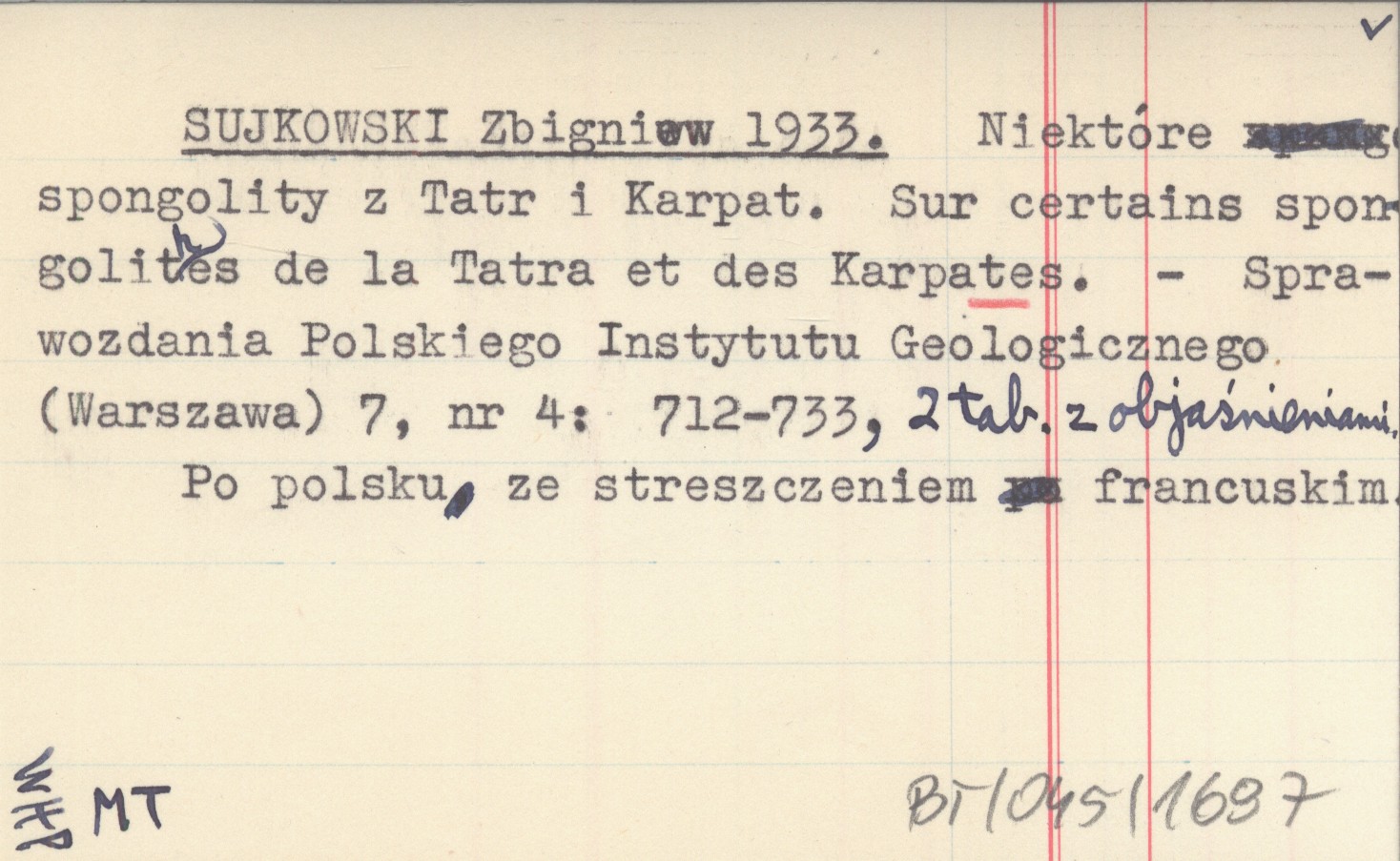 SUJKOWSKI Zbigniew 1933 Niektóre spongolity z Tatr i Karpat. Sur certains spongolithes de la Tatra et des Karpates.