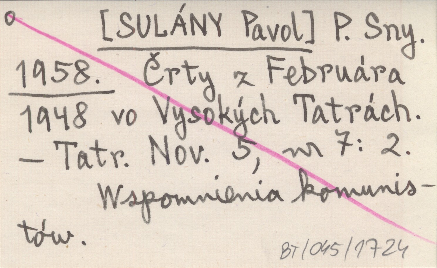 P. Sny. [SULÁNY Pavol] 1958 Črty z Februára 1948 vo Vysokých Tatrách.
