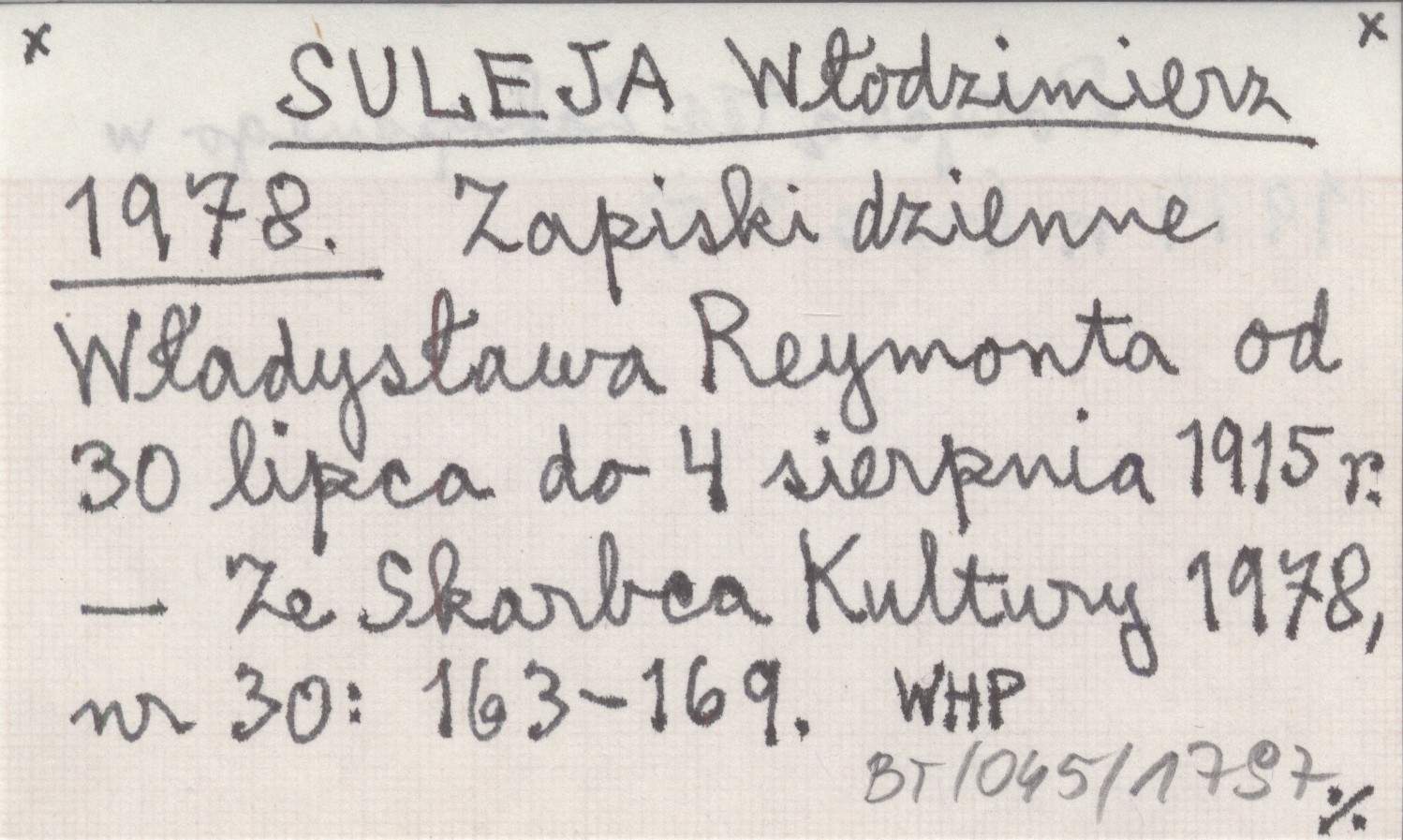 SULEJA Włodzimierz 1978 Zapiski dzienne Władysława Reymonta od 30 lipca do 4 sierpnia 1915 r.