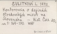 SULITKOVÁ L. 1972 Konferencia o dejinách stredovekých miest na Slovensku.