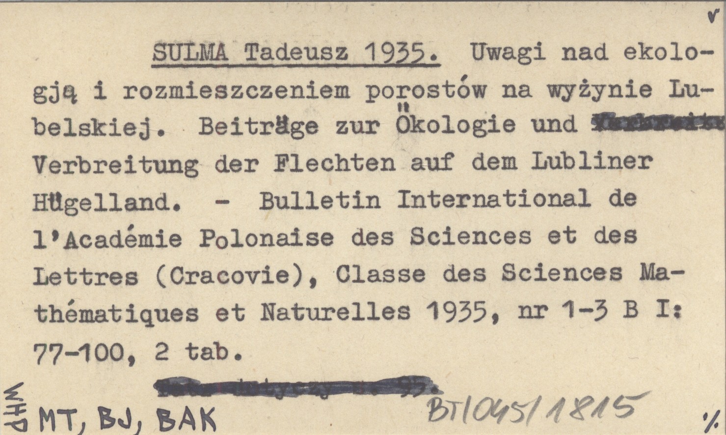 SULMA Tadeusz 1935 Uwagi nad ekologją i rozmieszczeniem porostów na wyżynie Lubelskiej. Beiträge zur Őkologie und Verbreitung der Flechten auf dem Lubliner Hügelland.