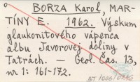 BORZA Karol MARTÍNY, E. ; 1962 Výskum glaukonitového vápenca albu Javorovej doliny v Tatrách.