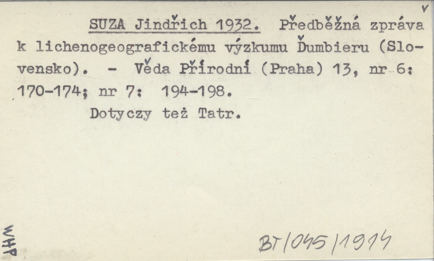 SUZA Jindřich 1932 Předběžná zpráva k lichenogeografickému výzkumu Ďumbieru (Slovensko).