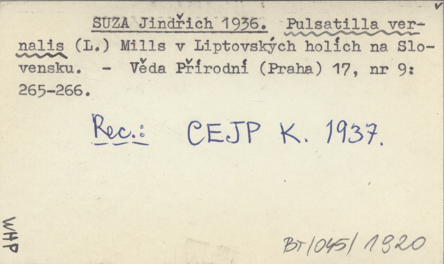 SUZA Jindřich 1936 Pulsatilla vernalis (L.) Mills v Liptovských holích na Slovensku.