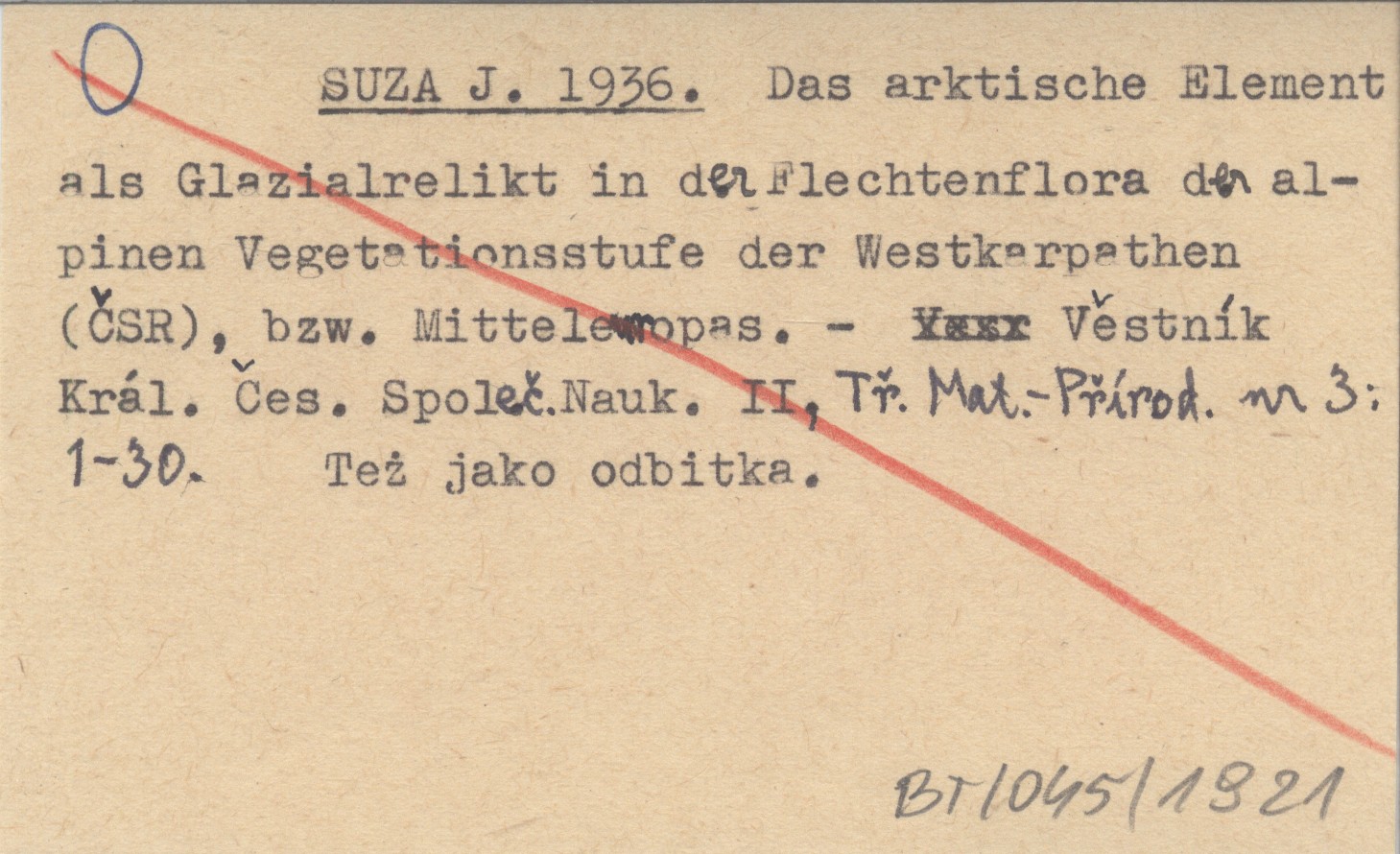 SUZA J. 1936 Das arktische Element als Glazialrelikt in der Flechtenflora der alpinen Vegetationsstufe der Westkarpathen (ČSR), bzw. Mitteleuropas.