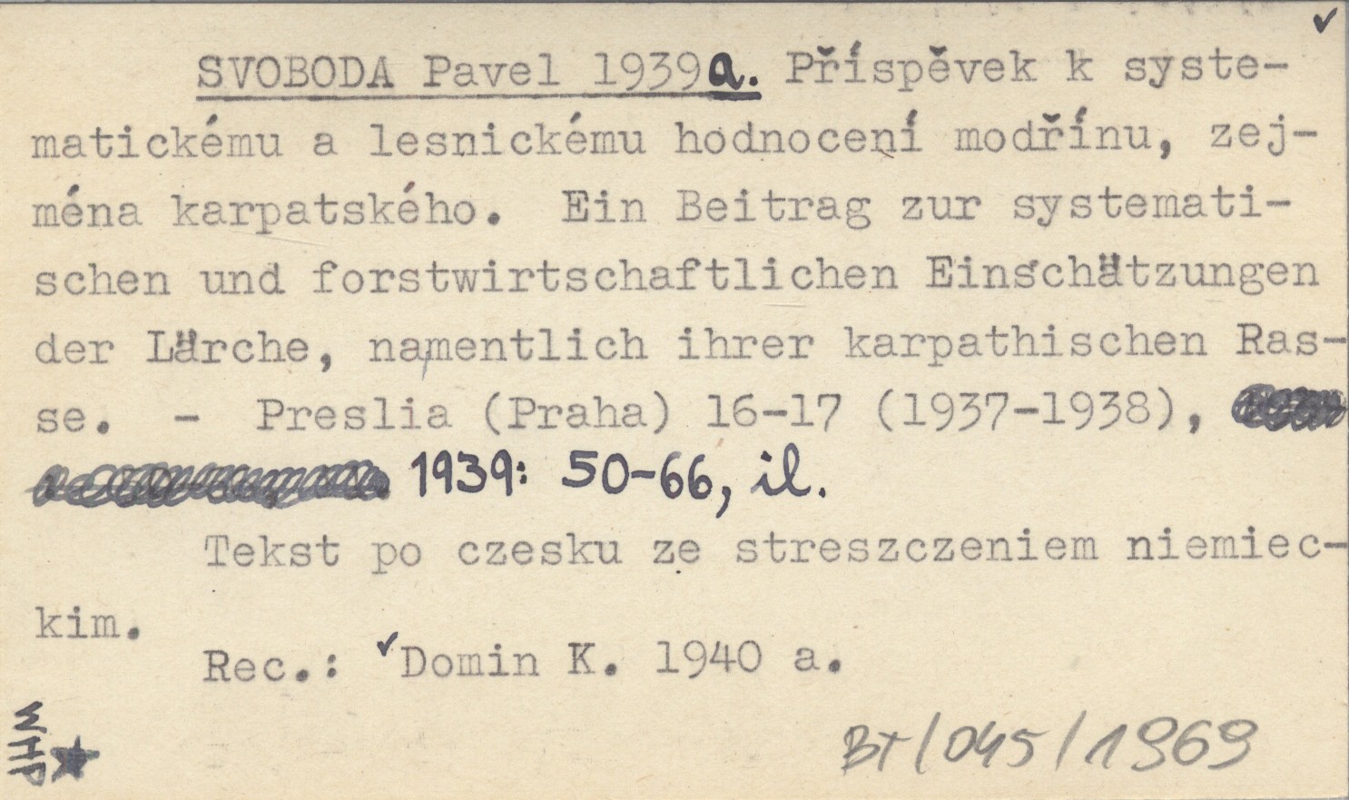 SVOBODA Pavel 1939 a Příspěvek k systematickému a lesnickému hodnocení modřínu, zejména karpatského. Ein Beitrag zur systematischen und forstwirtschaftlichen Einschätzungen der Lärche, namentlich ihrer karpathischen Rasse.