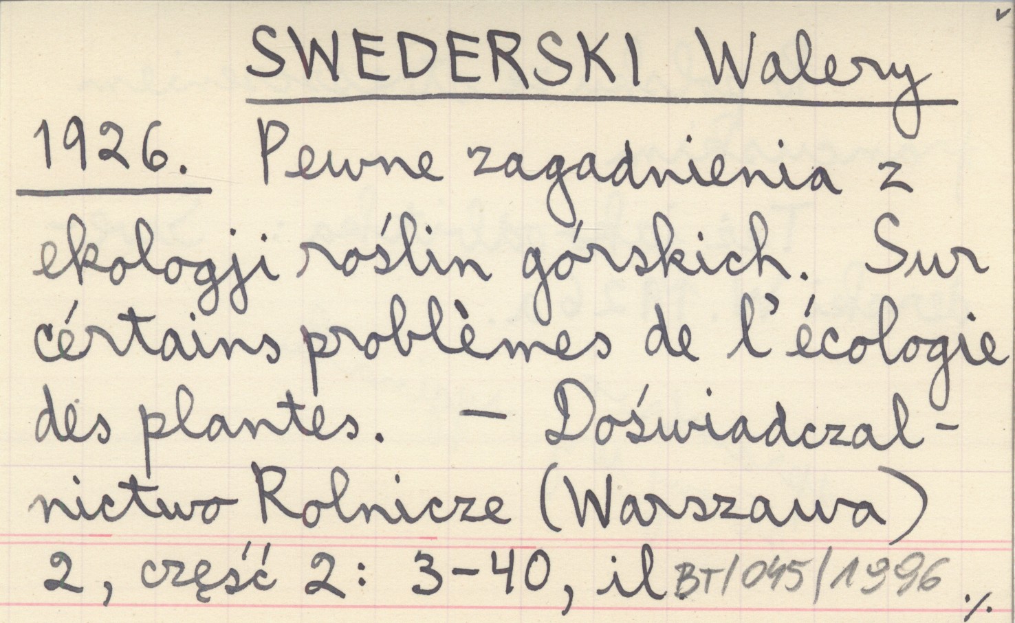 SWEDERSKI Walery 1926 Pewne zagadnienia z ekologji roślin górskich. Sur cértains problémes de l'écologie des plantes.