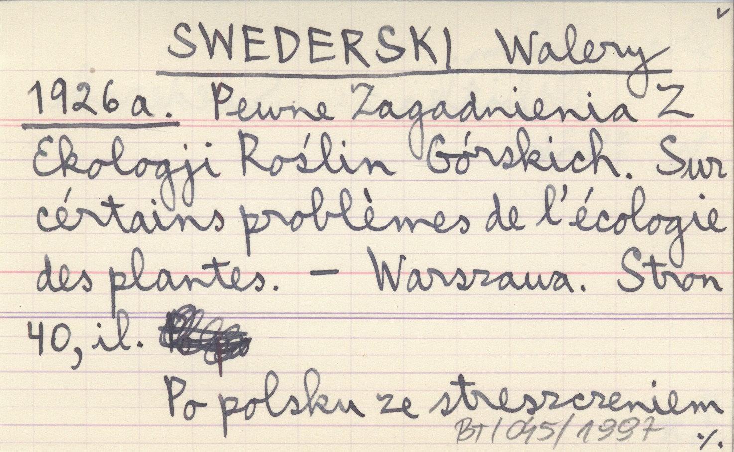 SWEDERSKI Walery 1926 a Pewne Zagadnienia Z Ekologji Roślin Górskich. Sur cértains problémes de l'écologie des plantes.