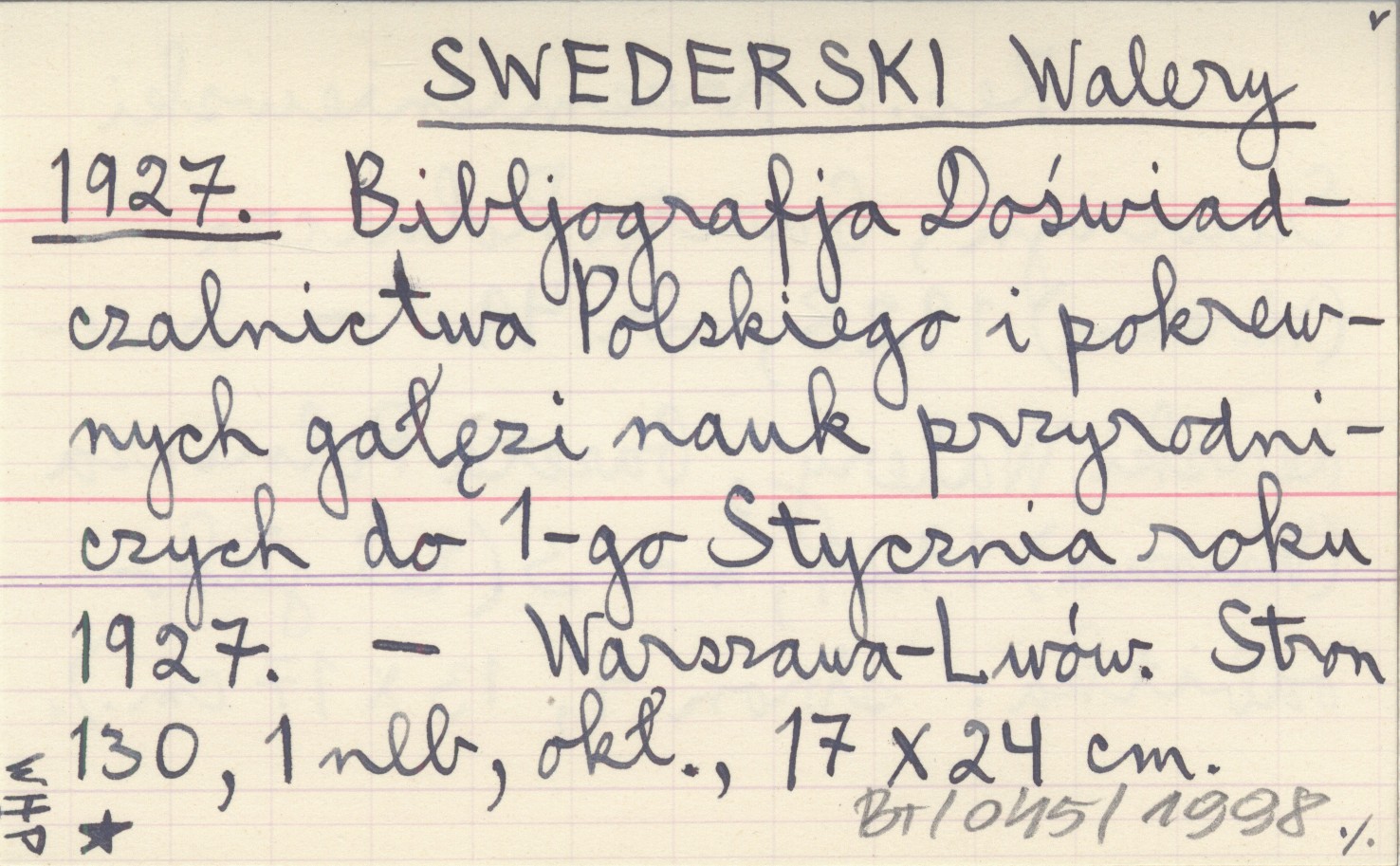SWEDERSKI Walery 1927 Bibljografja Doświadczalnictwa Polskiego i pokrewnych gałęzi nauk przyrodniczych do 1-go Stycznia roku 1927.