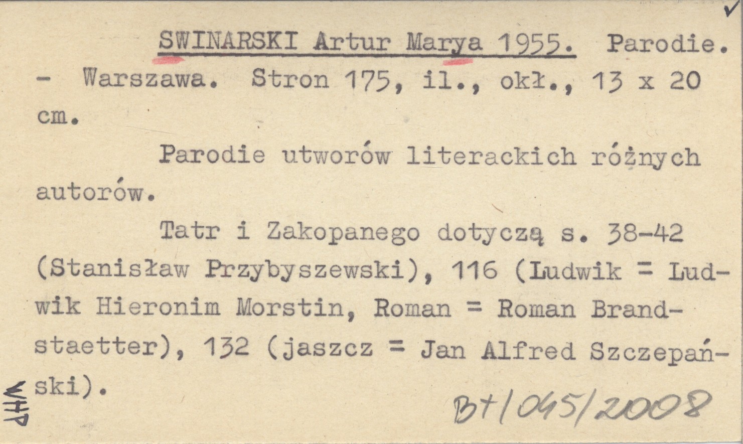 Warszawa , 175 s., il., okł., 13x20 cm. Parodie utworów literackich różnych autorów. Tatr i Zakopanego dotyczą s. 38-42 (Stanisław Przybyszewski), 116 (Ludwik=Ludwik Hieronim Morstin, Roman=Roman Brandstaetter), 132 (jaszcz=Jan Alfred Szczepański).