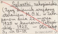 Sylwetki zakopiańskie. (Żywy dziennik urzędowy staraniem M.O.K. w Zakopanem dnia 22 marca 1925 w kawiarni Tatrzańskiej. 1925