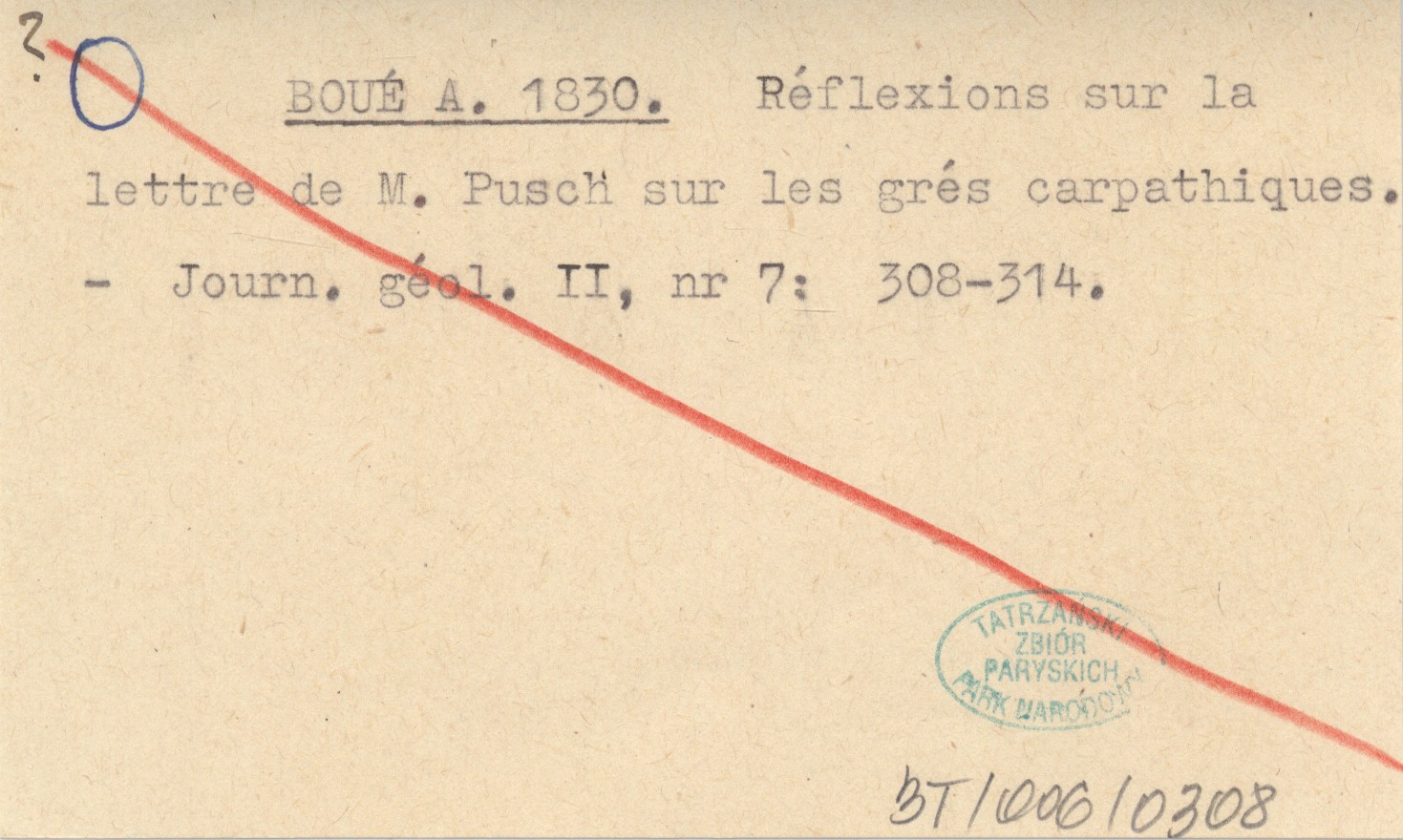 BOUÉ A. 1830 Réflexions sur la lettre de M. Pusch sur les grés carpathiques.