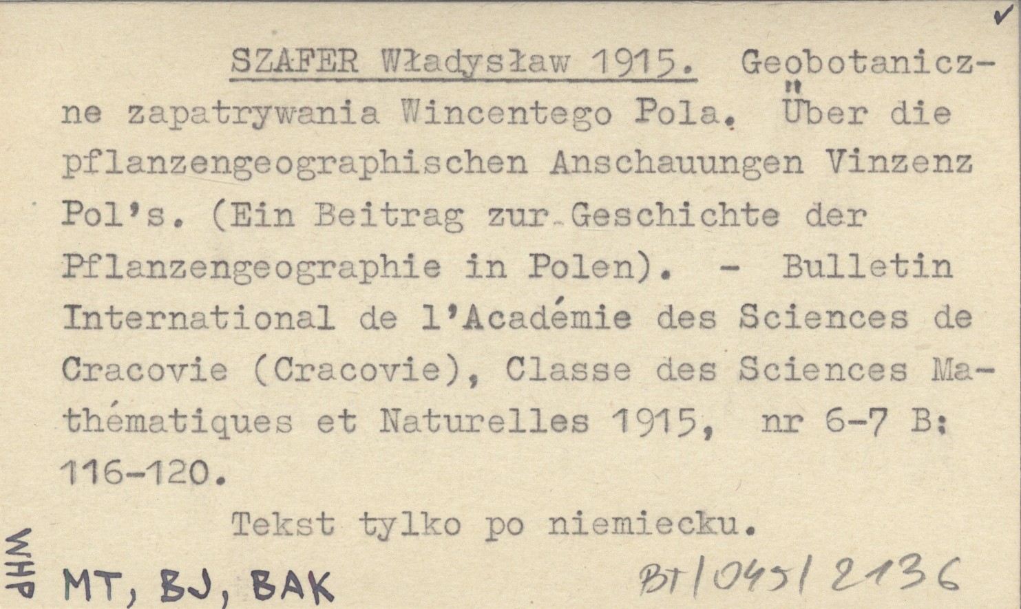 SZAFER Władysław 1915 Geobotaniczne zapatrywania Wincentego Pola. Über die pflanzengeographischen Anschauuungen Vinzenz Pol's. (Ein Beitrag zur Geschichte der Pflanzengeographie in Polen).
