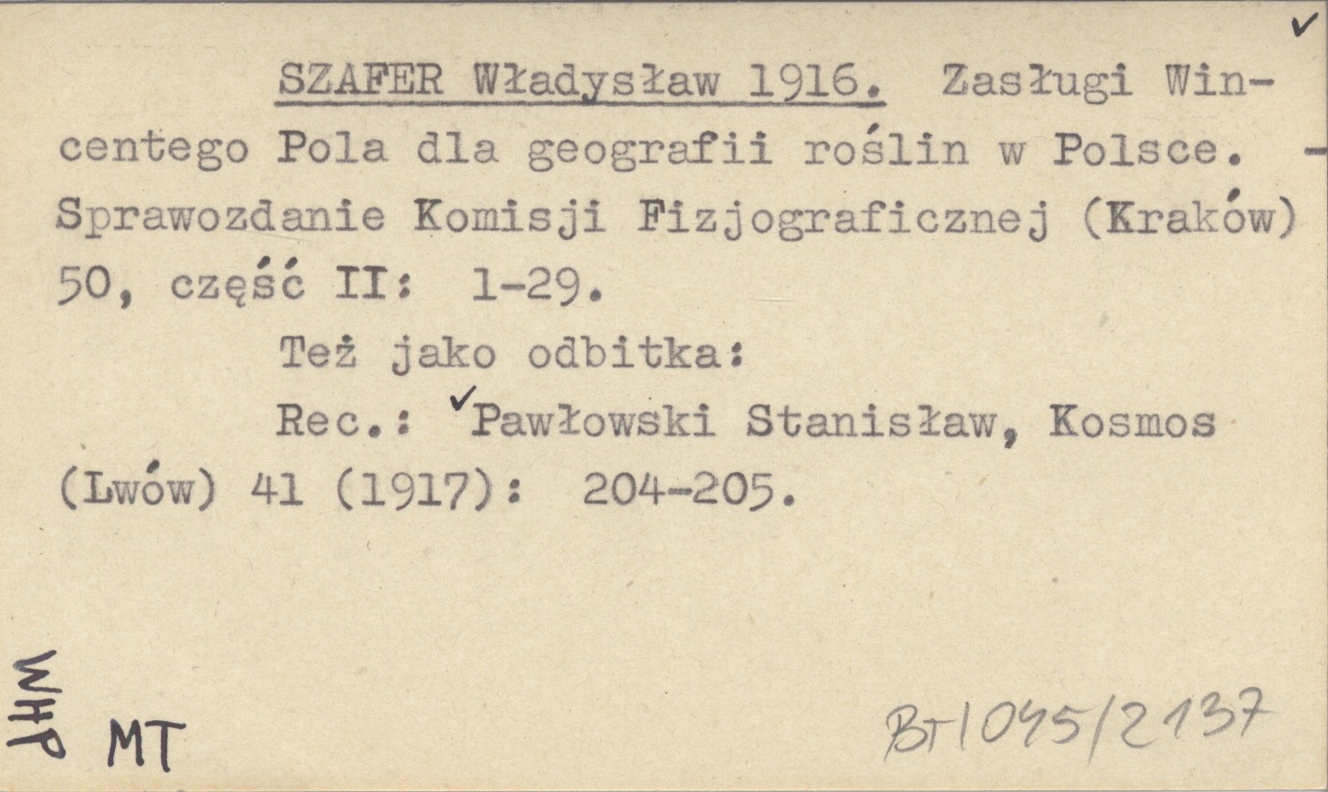 SZAFER Władysław 1916 Zasługi Wincentego Pola dla geografii roślin w Polsce.