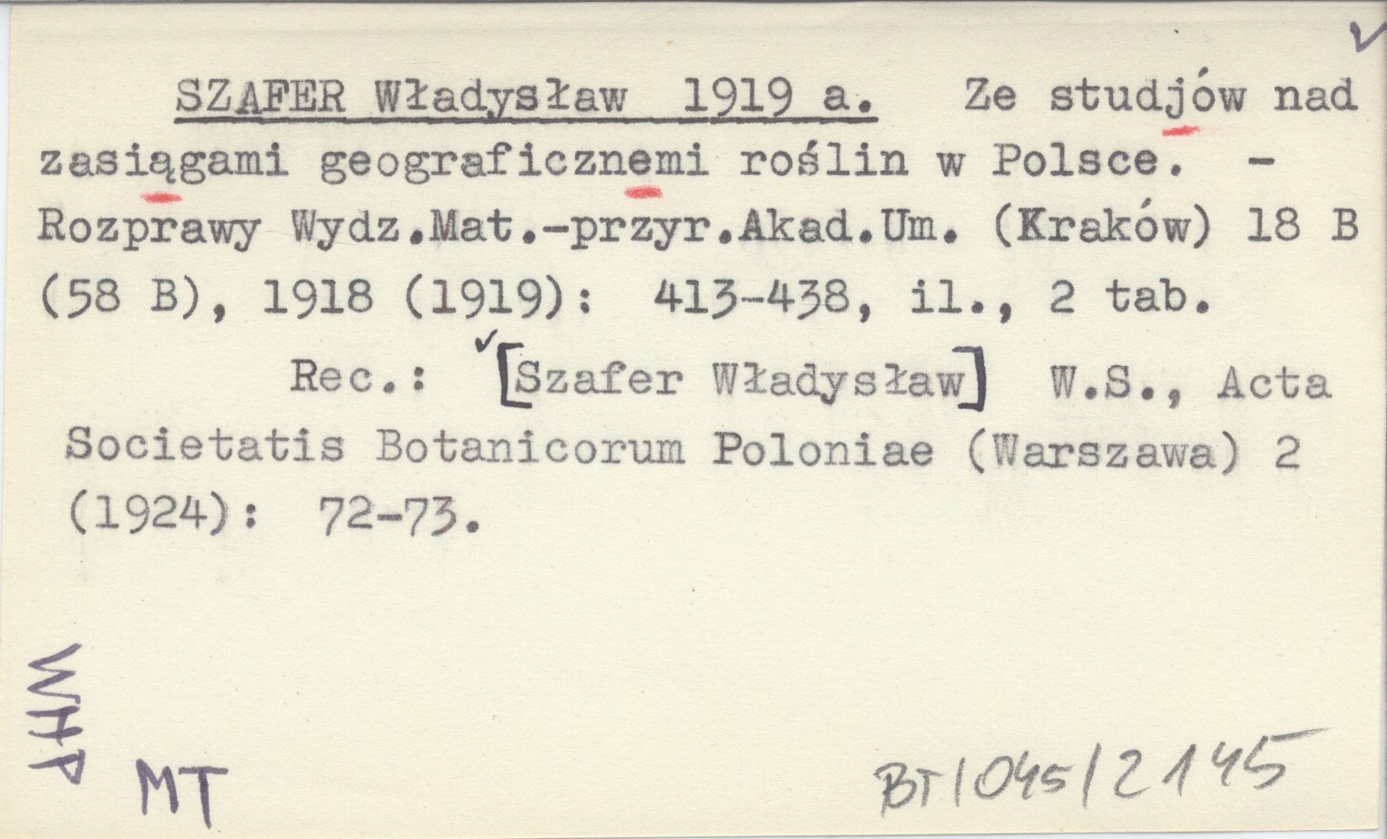 SZAFER Władysław 1919 a Ze studjów nad zasiągami geograficznemi roślin w Polsce.
