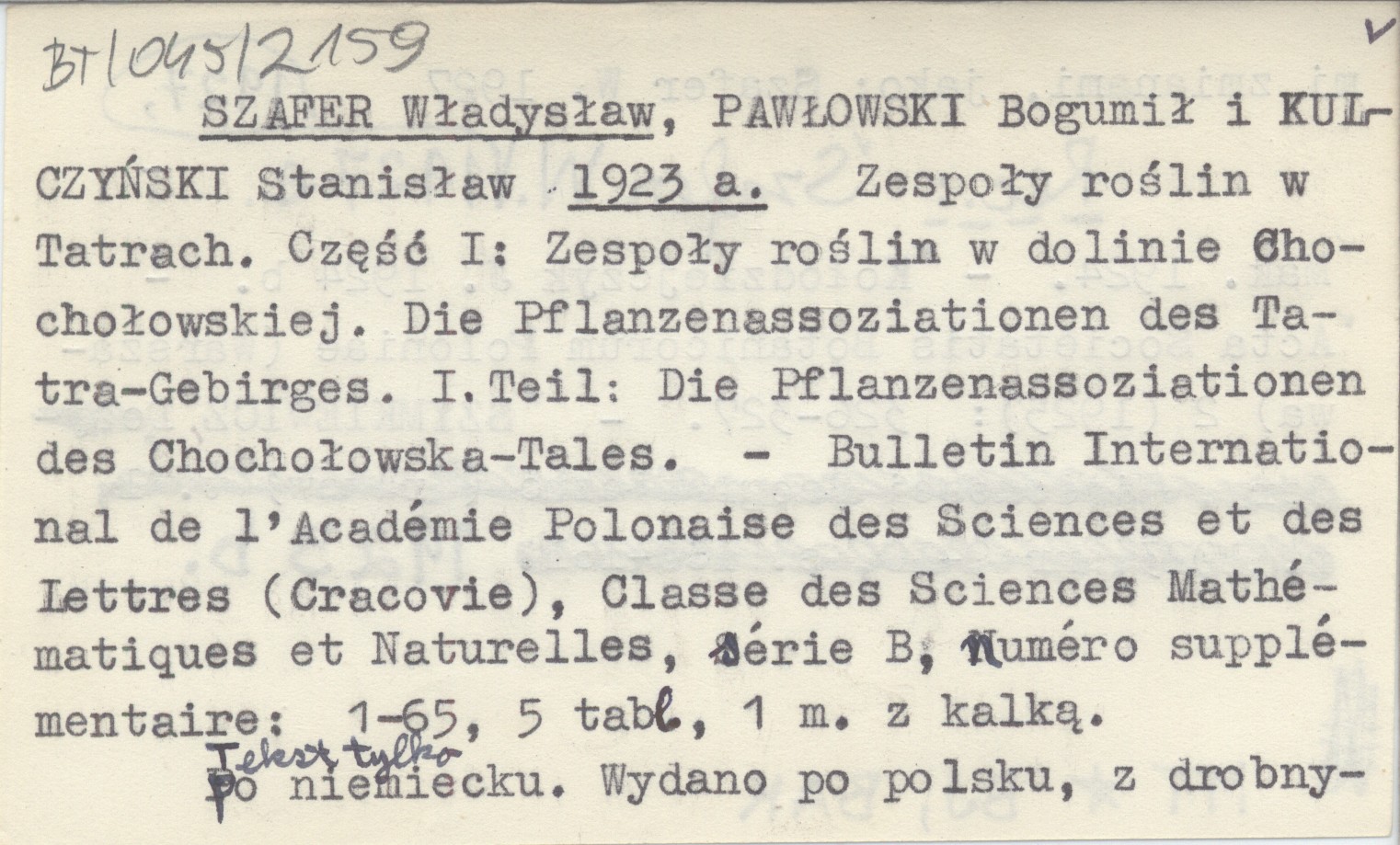 SZAFER Władysław PAWŁOWSKI, Bogumił. ; KULCZYŃSKI, Stanisław. ; 1923 a Zespoły roślin w Tatrach. Część I: Zespoły roślin w dolinie Chochołowskiej. Die Pflanzenassoziationen des Tatra-Gebirges. I. Teil. Pflanzenassoziationen des Chochołowska-Tales.