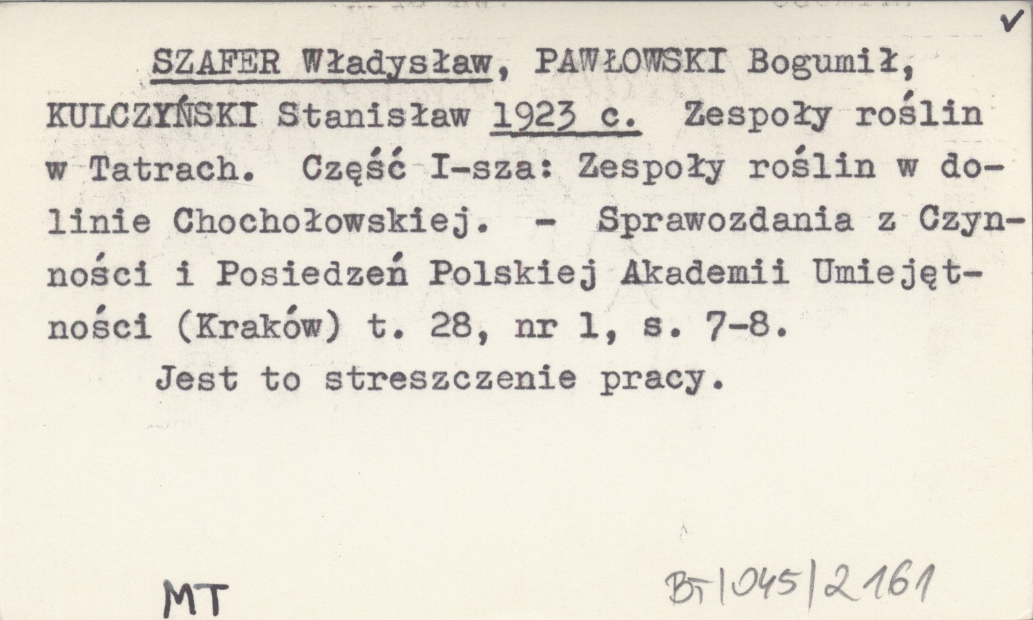 SZAFER Władysław PAWŁOWSKI, Bogumił. ; KULCZYŃSKI, Stanisław. ; 1923 c Zespoły roślin w Tatrach. Część I-sza: Zespoły roślin w dolinie Chochołowskiej.