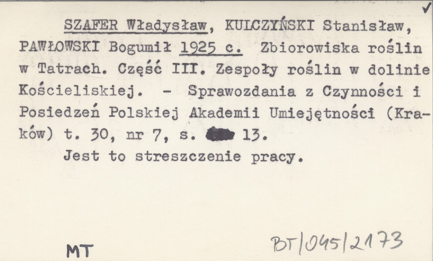 SZAFER Władysław KULCZYŃSKI, Stanisław. ; PAWŁOWSKI, Bogumił. ; 1925 c Zbiorowiska roślin w Tatrach. Część III. Zespoły roślin w dolinie Kościeliskiej.