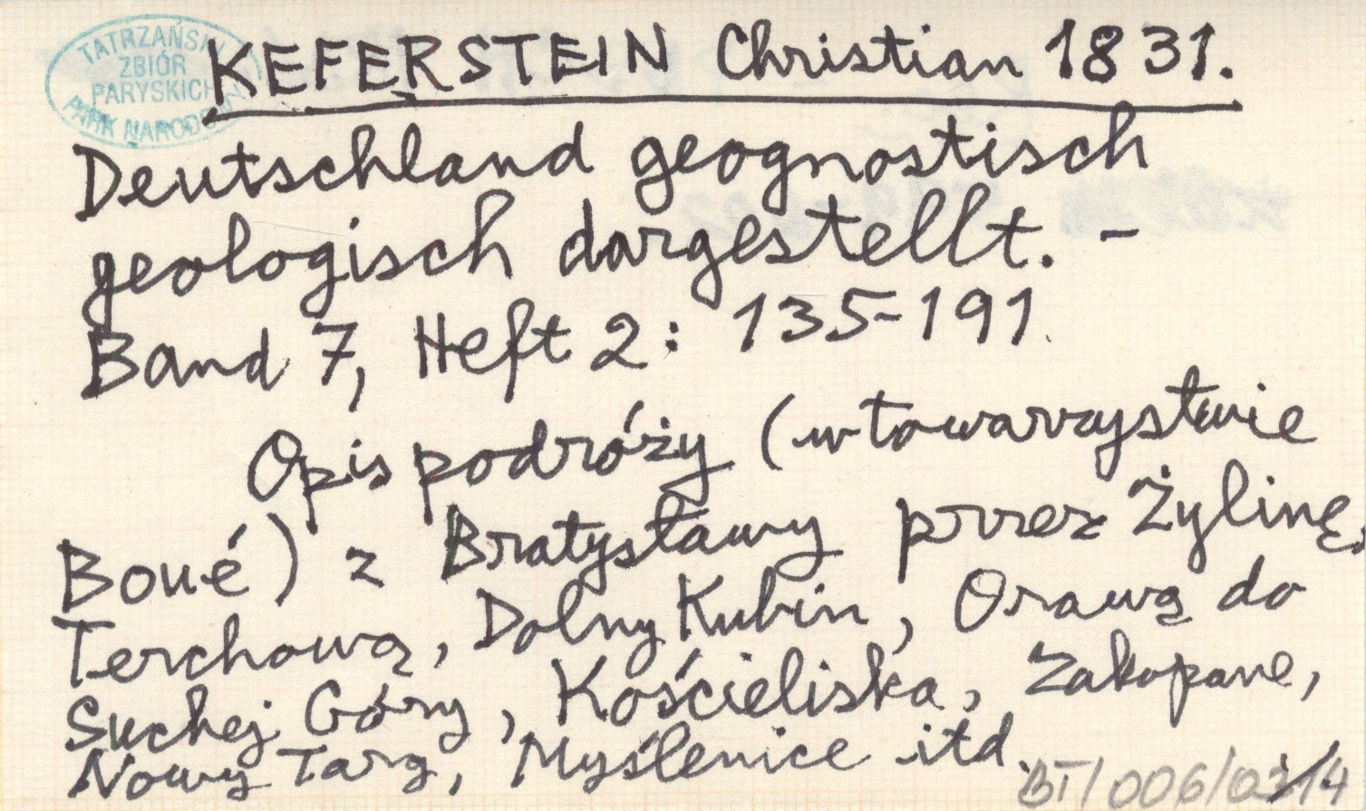, Band 7, Heft 2: 135-191. Opis podróży (w towarzystwie Boué) z Bratysławy przez Żylinę, Terchową, dolny Kubin, Orawę do Suchej Góry, Kościeliska, Zakopane, Nowy Targ, Myślenice itd. REC: PUSCH 1836: 599-602.